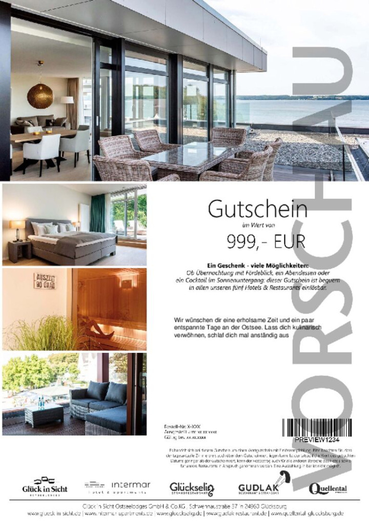 Ein Geschenk - viele Möglichkeiten: Ob Übernachtung mit Fördeblick, ein Abendessen oder ein Cocktail im Sonnenuntergang: dieser Gutschein ist bequem in allen unseren Hotels & Restaurants einlösbar.